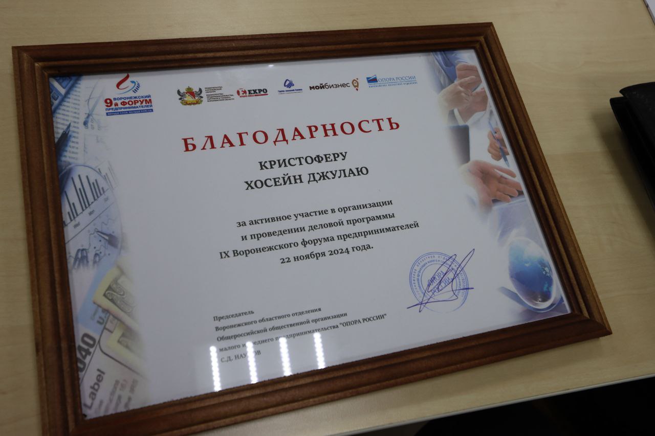 Прошло награждение Генерального директора Евразийской Организации Индустрии Кристофер Хоссейн Джулаи, за активное участие в организации и проведении деловой программы IX Воронежского форума предпринимателей 22 ноября 2024 года.